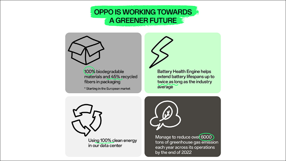 अपने प्रोडक्ट के यूजर एक्सपीरियंस को बेहतर बनाने के बारे में लगातार सोचते हुए OPPO का उद्देश्य ग्रीन प्रोडक्ट्स प्रदान करना भी है। इसके लिए OPPO ने पर्यावरण पर उनके प्रभाव को कम करने के लिए अपने प्रोडक्ट्स की लाइफ साइकिल मैनेजमेंट में सस्टेनेबिलिटी को एक महत्वपूर्ण लक्ष्य बनाया है।