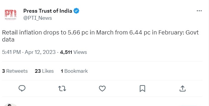 नवंबर और दिसंबर 2022 को छोड़कर, खुदरा मुद्रास्फीति जनवरी 2022 से आरबीआई के 6 प्रतिशत के ऊपरी सहिष्णुता स्तर से ऊपर बनी हुई थी। एक बार फिर इसमें नरमी देखी गई है।