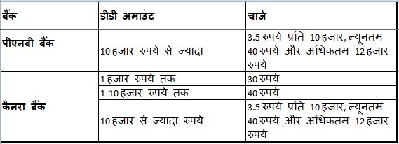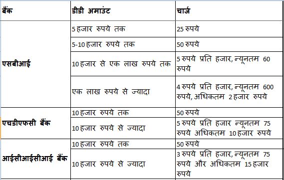 साथ ही डिमांड ड्राफ्ट में कोई हिडन चार्जेस नहीं होते। हालांकि, हर बैंक में डीडी चार्जेस अलग-अलग होते हैं। यह बैंक और डीडी की रकम के आधार पर निर्भर करता है। देश के अधिकतर बैंक 10 हजार रुपये के डिमांड ड्राफ्ट पर 25 से 50 रुपये तक की फीस लेते हैं। आइये देखते हैं अलग-अलग बैंकों के डीडी चार्ज-
