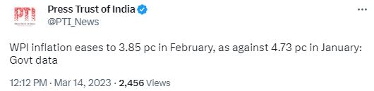 नई दिल्ली, बिजनेस डेस्क। फरवरी 2023 के थोक मुद्रास्फीति (WPI Inflation) के आंकड़े सांख्यिकी और कार्यक्रम कार्यान्वयन मंत्रालय (Ministry of Statistics and Program Implementation) की ओर से जारी कर दिए गए हैं। आंकड़ों के मुताबिक, फरवरी 2023 में थोक मुद्रास्फीति 3.85 प्रतिशत हो गई है। जनवरी में ये आंकड़ा 4.73 प्रतिशत और दिसंबर में 4.95 प्रतिशत था।