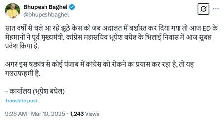 ईडी की कार्रवाई पर भूपेश बघेल की कार्यालय की ओर से प्रतिक्रिया दी गई। उनके एक्स हैंडल पर पोस्त करते हुए लिखा गया," सात वर्षों से चले आ रहे झूठे केस को जब अदालत में बर्खास्त कर दिया गया तो आज ED के मेहमानों ने पूर्व मुख्यमंत्री, कांग्रेस महासचिव भूपेश बघेल के भिलाई निवास में आज सुबह प्रवेश किया है। अगर इस षड्यंत्र से कोई पंजाब में कांग्रेस को रोकने का प्रयास कर रहा है, तो यह गलतफहमी है।"
