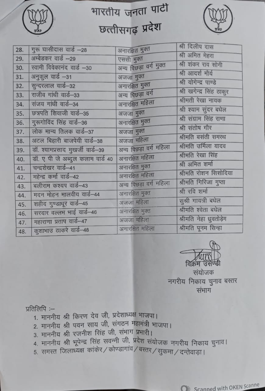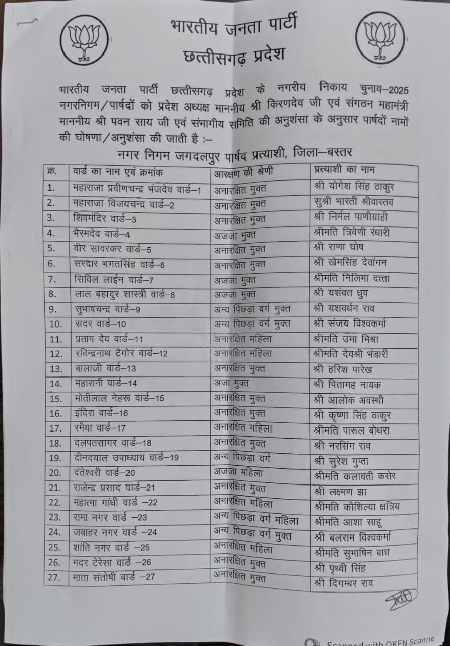(नगर निगम जगदलपुर के वार्ड प्रत्याशियों की सूची)