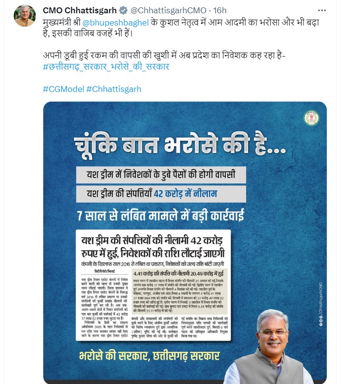 भूपेश बघेल सरकार की चिटफंड कंपनियों पर सख्ती, यश ड्रीम की सम्पत्ति की गई नीलाम; निवेशकों को लौटाई जाएगी राशि