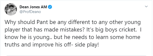 पूर्व ऑस्ट्रेलियाई क्रिकेटर डीन जोन्स ने युवराज के पंत का बचाव करने पर प्रतिक्रिया दी। जोन्स ने कहा कि "आखिर पंत द्वारा की जा रही गलती बाकी के युवा क्रिकेटर्स से अलग कैसे होनी चाहिए ? ये बड़े लोगों का क्रिकेट है। मुझे मालूम है कि वह युवा हैं लेकिन उनको कुछ सच्चाई को जानने की जरूरत है और अपने ऑफ साइड के खेल में सुधार लाने की जरूरत है।"
