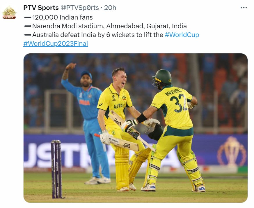 ऑस्ट्रेलिया के छठी बार चैंपियन बनने पर एक तरफ जहां भारतीय फैंस का दिल टूट गया। वहीं, पड़ोसी मुल्क पाकिस्तान में फैंस ने ऑस्ट्रेलिया की जीत की खुशी मनाई। पाकिस्तानी मीडिया ने भी भारतीय टीम की आलोचना की। पाकिस्तान के पीटीवी ने सोशल मीडिया पर लिखा, 1 अरब लोग, नरेंद्र मोदी स्टेडियम और ऑस्ट्रेलिया छठी बार चैंपियन बना।'
