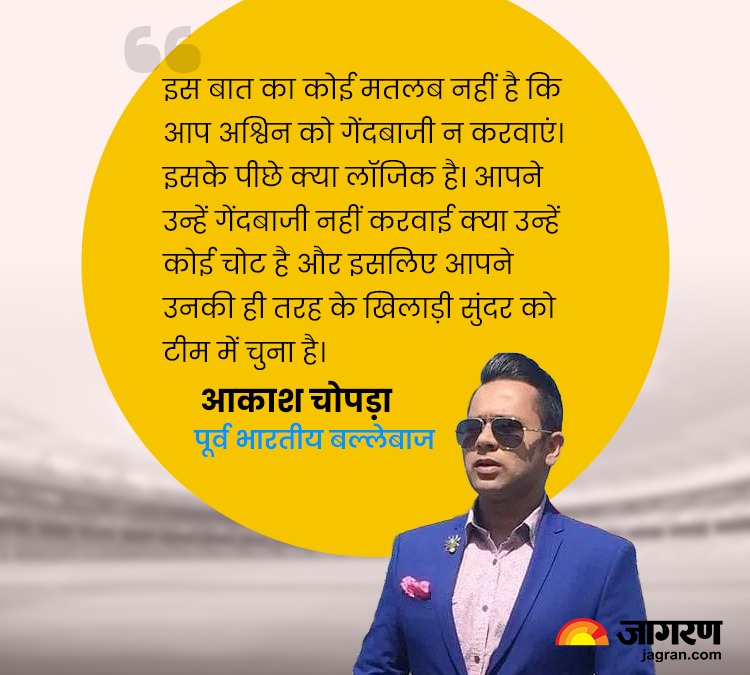अश्विन को पहले टेस्ट मैच में देर से गेंदबाजी मिली थी। चौथी पारी में उन्होंने सिर्फ दो ओवर फेंके थे। आकाश ने इस बात को सुंदर के टीम में शामिल करने से जोड़ा है। उन्होंने कहा, "सुंदर को इसलिए शामिल किया गया है क्योंकि आखिरी दिन उन्हें सिर्फ दो ओवर ही दिए गए थे। मैच जब खत्म होने वाला था तब उन्हें दो ओवर मिले थे। इस बात का कोई मतलब नहीं है कि आप अश्विन को गेंदबाजी न करवाएं। इसके पीछे क्या लॉजिक है। आपने उन्हें गेंदबाजी नहीं करवाई क्या उन्हें कोई चोट है और इसलिए आपने उनकी ही तरह के खिलाड़ी सुंदर को टीम में चुना है।"