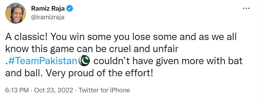 पाकिस्तान की इस क्लोज हार पर पीसीबी के चेयरमैन रमीज राजा ने अपनी प्रतिक्रिया दी है। उन्होंने सोशल मीडिया के माध्यम से इस के मैच को लेकर अपनी भावनाएं व्यक्त की है। भारत और पाकिस्तान के बीच मैच में हुई कड़ी टक्कर की उन्होंने प्रशंसा की है।