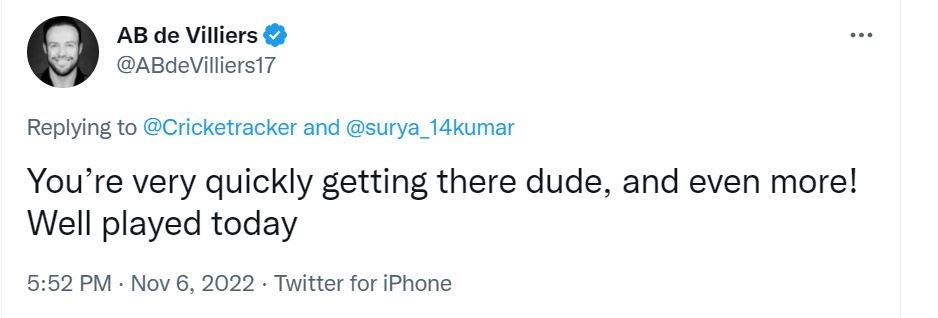 मैच के बाद जब उनकी तुलना 360 डिग्री के नाम से मशहूर एबी डिविलियर्स से की गई तो उन्होंने कहा कि दुनिया में 360 डिग्री एक ही हैं और वह उनके जैसा बनने की कोशिश कर रहे हैं। हालांकि बाद में एबी डिविलियर्स ने भी सूर्या की बल्लेबाजी और खुद से उनकी तुलना पर अपनी प्रतिक्रिया दी। डिविलियर्स ने ट्वीट कर कहा कि आप तेजी से उस दिशा में बढ़ रहे हैं और मुझसे भी आगे निकलें। आज बहुत अच्छा खेला।