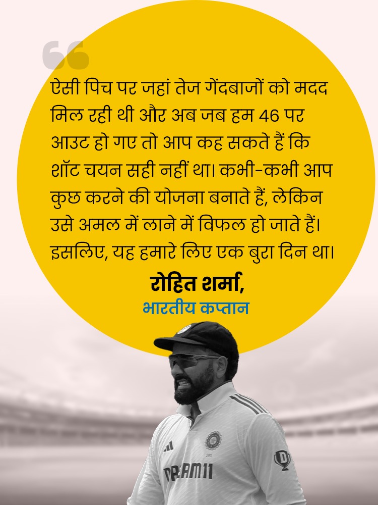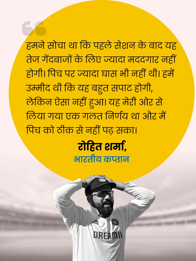 पहले टेस्ट मैच की पहली पारी में भारत के शर्मनाक प्रदशर्न पर कप्तान रोहित शर्मा ने पूरी जिम्मेदारी ली है। दूसरे दिन का खेल खत्म होने के बाद रोहित शर्मा ने माना कि वह पिच को पढ़ाने में नाकाम रहे। उन्होंने यह भी कहा कि पहले बल्लेबाजी करने का उनका फैसला गलत रहा। इसके अलावा केएल राहुल की बैटिंग पोजिशन चेंज करने के सवाल का भी जवाब दिया।
