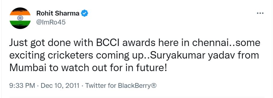 11 साल पहले रोहित ने सूर्यकुमार यादव को लेकर ट्वीट किया था। उन्होंने उस ट्वीट में उस वक्त लिखा था कि अभी बीसीसीआइ का चेन्नई में पुरस्कार समारोह खत्म हुआ है। कुछ एक्साइटिंग क्रिकेटर आने वाले हैं। मुंबई के सूर्यकुमार यादव एक ऐसे बल्लेबाज होंगे, जिन पर भविष्य में सबकी नजर होगी।