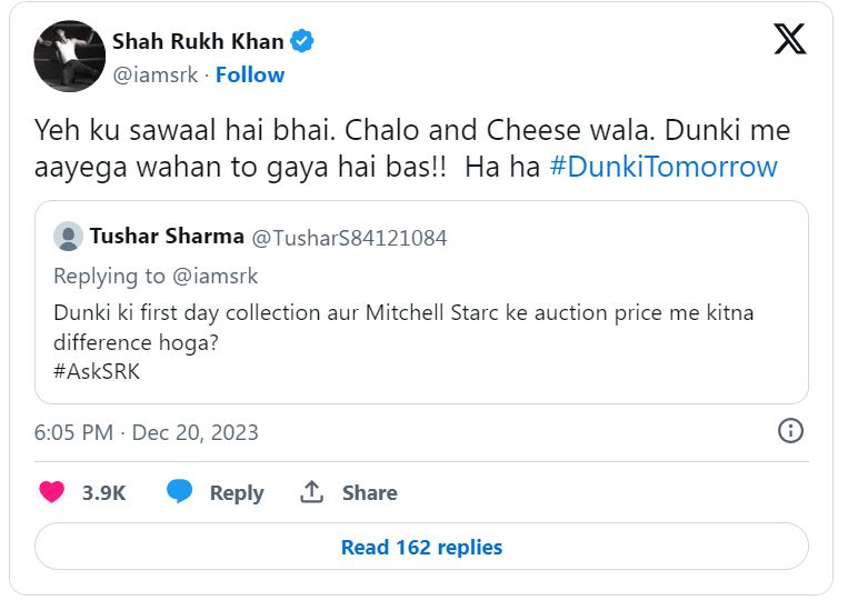 ऑस्ट्रेलियाई तेज गेंदबाज मिचेल स्टार्क लीग के इतिहास में सबसे महंगे खिलाड़े बने। ऐसे में बुधवार को एक फैंस ने शाहरुख खान उनकी फिल्म डंकी की रिलीज से पहले एक अजीबोगरीब सवाल पूछा। फैंस ने शाहरुख खान से पूछा कि क्या डंकी का बॉक्स ऑफिस कलेक्शन उस कीमत से अधिक होगा जो केकेआर ने मंगलवार को मिनी नीलामी में मिशेल स्टार्क को दी थी।
