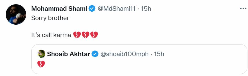 सोशल मीडिया पर शमी ने शोएब अख्तर के टूटे दिल वाले इमोजी को शेयर करते हुए लिखा था कि सॉरी ब्रदर इट्स कॉल कर्मा। इसके बाद दोनों को लेकर चर्चा शुरू हो गई थी। इतना ही नहीं मोहम्मद शमी ने इंग्लैंड को टी20 वर्ल्ड चैंपियन बनने पर बधाई भी दी। उन्होंने इंग्लैंड की इस जीत को वेल डिजर्व बताया और बेन स्टोक्स की इनिंग की तारीफ भी की। उन्होंने साथ ही पाकिस्तान की गेंदबाजी की भी तारीफ की।