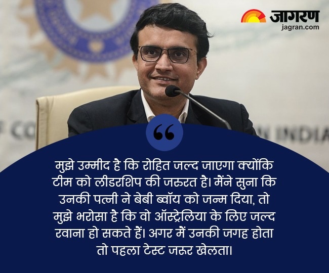 स्पोर्ट्स डेस्क, नई दिल्ली। भारतीय क्रिकेट कंट्रोल बोर्ड के पूर्व अध्यक्ष सौरव गांगुली चाहते हैं कि ऑस्ट्रेलिया के खिलाफ 22 नवंबर से पर्थ में शुरू होने वाले पहले टेस्ट के लिए रोहित शर्मा भारतीय टीम से जुड़े। रोहित शर्मा शुक्रवार को दूसरी बार पिता बने। उनकी पत्नी ऋतिका ने बेटे को जन्म दिया।