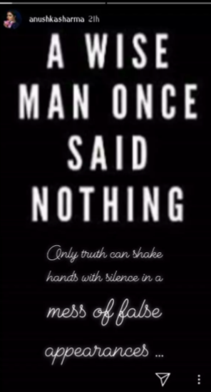 अनुष्का का पलटवार : रोहित शर्मा द्वारा अनफॉलो किए जाने के बाद अनुष्का शर्मा ने इंस्टाग्राम पर एक पोस्ट डाला जिसने आग में घी डालने का काम किया। अनुष्का ने शुक्रवार को इंस्टाग्राम पर एक स्टोरी साझा की जिसमें उन्होंने उपकप्तान रोहित को निशाना बनाया है। अनुष्का ने अपनी स्टोरी में लिखा है कि एक बुद्धिमान इंसान ने एक बार भी कुछ नहीं कहा। सच कभी झूठ के दिखावे में नहीं पड़ता है।