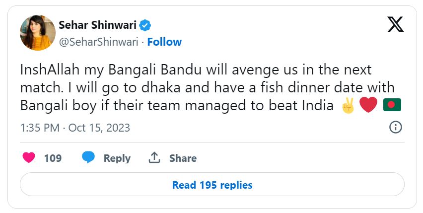 पाकिस्तानी अभिनेत्री सहर शिनवारी ने सोशल मीडिया पर लिखा, "इंशाअल्लाह मेरे बंगाली बंधु अगले मैच में हमारा बदला लेंगे। अगर उनकी टीम भारत को हराने में कामयाब रही तो मैं ढाका जाऊंगी और बंगाली लड़के के साथ फिश डिनर डेट करूंगी।"