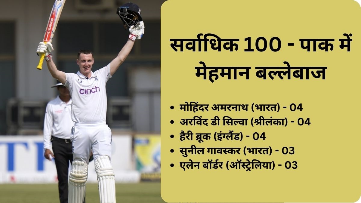 बहरहाल, हैरी ब्रूक ने पाकिस्तान के गेंदबाजों की धज्जियां उड़ाते हुए वर्ल्ड रिकॉर्ड की बराबरी की। ब्रूक ने पाकिस्तान में चौथा शतक जमाया। इस तरह वह पाकिस्तान में बतौर विदेशी बल्लेबाज सबसे ज्यादा टेस्ट शतक जमाने वाले बल्लेबाज बन गए हैं। ब्रूक ने भारत के पूर्व ऑलराउंडर मोहिंदर अमरनाथ और पूर्व श्रीलंकाई बल्लेबाज अरविंद डी सिल्वा की बराबरी की। इन तीनों बल्लेबाजों ने पाकिस्तान में चार-चार शतक जमाएं।