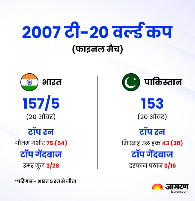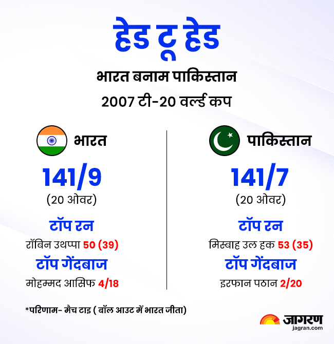 भारत और पाकिस्तान के बीच 2007 के टी20 वर्ल्ड कप में दो बार भिड़त हुए। पहली बार 14 सितम्बर 2007 को खेले गए टी20 वर्ल्ड कप के ग्रुप स्टेज मुकाबले में। इस मैच में भारत को बॉल आउट से जीत मिली थी। दूसरी बार दोनों टीमें 24 सितंबर को खेले गए फाइनल में आमने-सामने हुए। इस मैच में भारत ने पाकिस्तान को 5 रन से हराकर चैंपियन बना था।