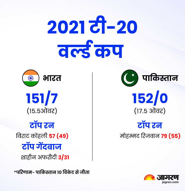 यूएई में साल 2021 यह टूर्नामेंट आयोजित किया गया था। लगातार पांच बार हार झेल चुकी पाकिस्तान ने इतिहास पलट दिया। भारत ने पहले बल्लेबाजी करते हुए 157 रनों का स्कोर किया। जवाब पाकिस्तान ने बिना विकेट खोए जीत दर्ज की। टी20 वर्ल्ड कप के इतिहास में पाकिस्तान ने भारत को पहली बार हराया था।