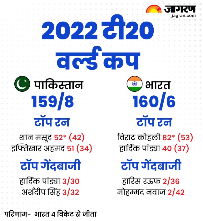 ऑस्ट्रेलिया में खेले गए साल 2022 टी20 वर्ल्ड में भारत ने साल 2021 में मिली करारी शिकस्त का बदला लिया। 23 अक्टूबर को खेले गए मैच में पाकिस्तान ने पहले बल्लेबाजी करते हुए 159 रन बनाए। भारत ने विराट कोहली के नाबाद 82 रन की मदद से चार विकेट से जीत दर्ज कर ली।