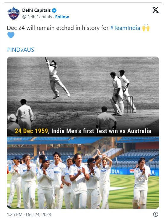 भारतीय टेस्ट क्रिकेट इतिहास में 24 दिसंबर सुनहरे अक्षर में एक बार फिर दर्ज हो गया। 64 साल पहले भारतीय पुरुष टीम ने जो कमाल किया था वही कमाल महिला टीम ने दोहराया है। 24 दिसंबर 1959 को भारतीय पुरुष टीम ने ऑस्ट्रेलिया के खिलाफ पहला टेस्ट मैच जीता था। भारत ने तब ऑस्ट्रेलिया को 119 रन से हराया था।