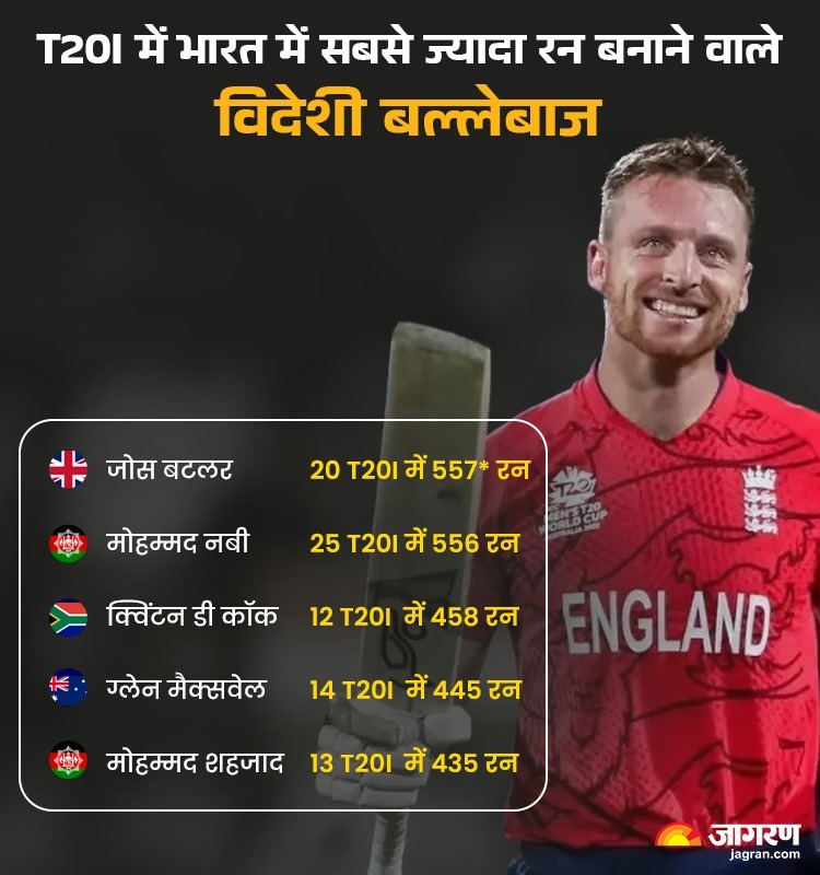 उन्होंने अफगानिस्तान के मोहम्मद नबी को पछाड़ दिया, जिन्होंने 25 टी20 इंटरनेशनल मैचों में 556 रन बनाए। अब जोस बटलर टी20I में भारत में सबसे ज्यादा रन बनाने वाले विदेशी बल्लेबाज बन गए हैं। उन्होंने 20वें टी20I मैच में 557* रन बना लिए हैं।