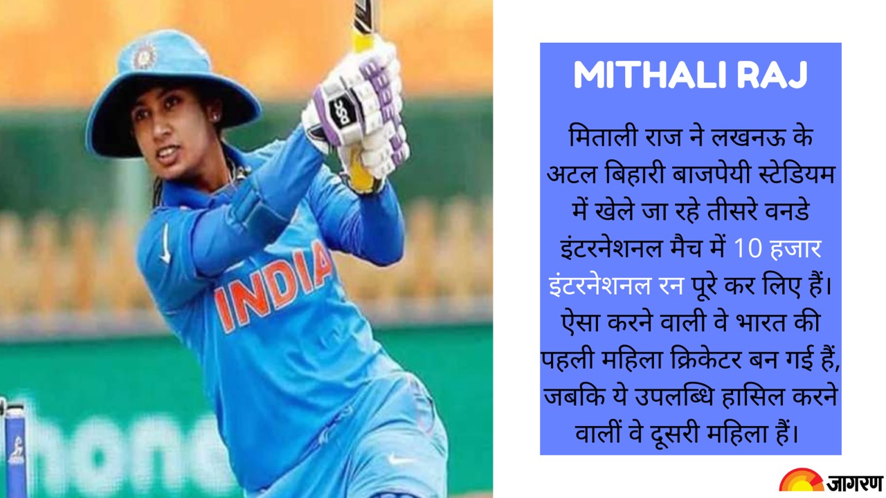 नई दिल्ली, जेएनएन। भारतीय महिला वनडे टीम की कप्तान मिताली राज ने एक बड़ा कीर्तिमान हासिल कर लिया है। मिताली राज ने लखनऊ के अटल बिहारी बाजपेयी स्टेडियम में खेले जा रहे तीसरे वनडे इंटरनेशनल मैच में 10 हजार इंटरनेशनल रन पूरे कर लिए हैं। ऐसा करने वाली वे भारत की पहली महिला क्रिकेटर बन गई हैं, जबकि ये उपलब्धि हासिल करने वालीं वे दूसरी महिला हैं। उनसे पहले सिर्फ एक महिला ने ये उपलब्धि हासिल की थी।