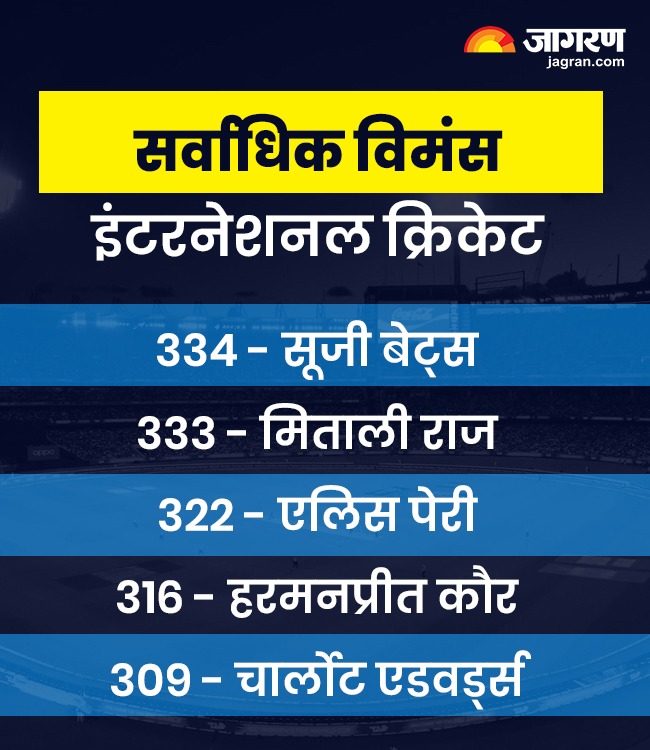 पूर्व भारतीय कप्तान मिताली राज ने अपने करियर में 333 इंटरनेशनल मैच खेले थे। इस लिस्ट में तीसरे पर एलिस पेरी हैं, जिन्होंने 322 इंटरनेशनल मैच खेले हैं। फेहरिस्त में चौथे नंबर पर भारतीय कप्तान हरमनप्रीत कौर और 5वें पर चार्लोट एडवर्ड्स हैं। कौर अब तक 316 इंटरनेशनल मैच और एडवर्ड्स 309 मुकाबले खेल चुकी हैं।