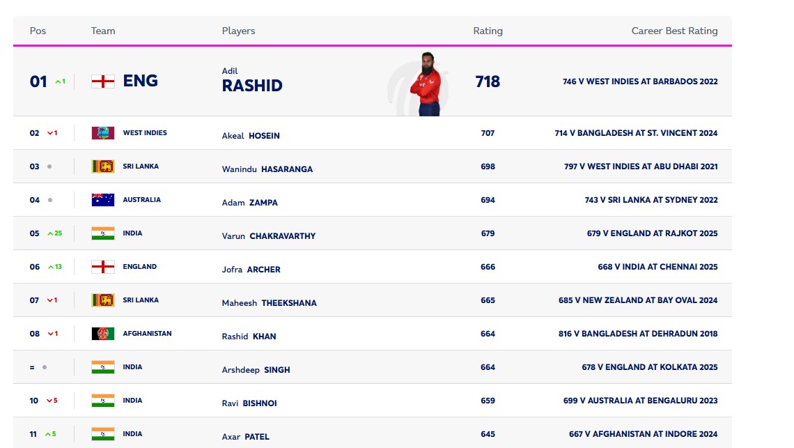 ICC Rankings में Adil Rashid बने नंबर-1 बॉलर, वरुण चक्रवर्ती ने लगाई 25 स्थानों की छलांग; इन स्टार्स ने झेला नुकसान