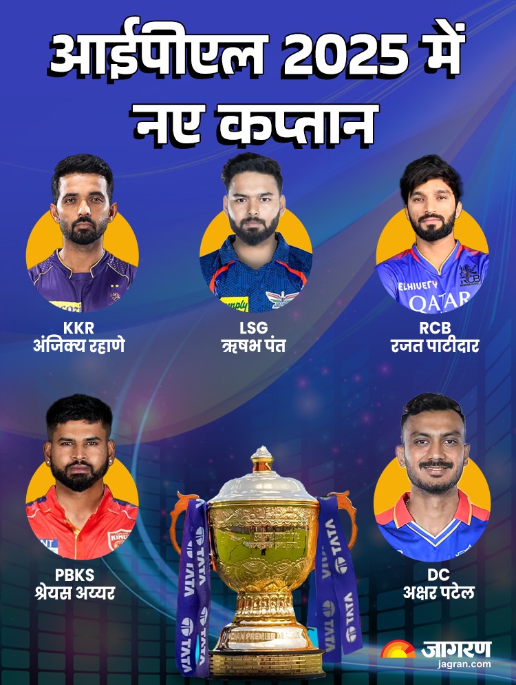 IPL 2025 से पहले कोलकता नाइटराइडर्स, रॉयल चैलेंजर्स बेंगलुरु, लखनऊ सुपर जायंट्स, पंजाब किंग्स और दिल्ली कैपिटल्स ने 18वें सीजन से पहले अपने कप्तान बदले हैं। KKR ने अजिंक्य रहाणे को, RCB ने रजत पाटीदार को, LSG ने ऋषभ पंत को, PBKS ने श्रेयस अय्यर और DC ने अक्षर पटेल को फ्रेंचाइजी की कमान सौंपी।