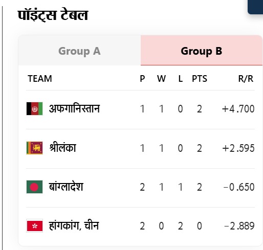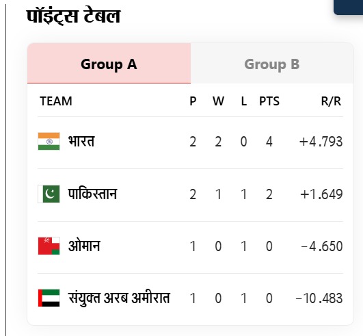 वहीं हार के बाद भी पाकिस्तान टीम दूसरे पायदान पर है। अपने पहले मैच में पाकिस्तान ने ओमान को हराकर 2 अंक अर्जित किए थे। पाकिस्तान को अगर सुपर-4 में जगह बनानी है तो अपना अगला मैच हर हाल में जीतना होगा। अगले मैच में पाकिस्तान टीम का सामना यूएई से होगा। दुबई के मैदान में यह मुकाबला 17 सितंबर को खेला जाएगा।
