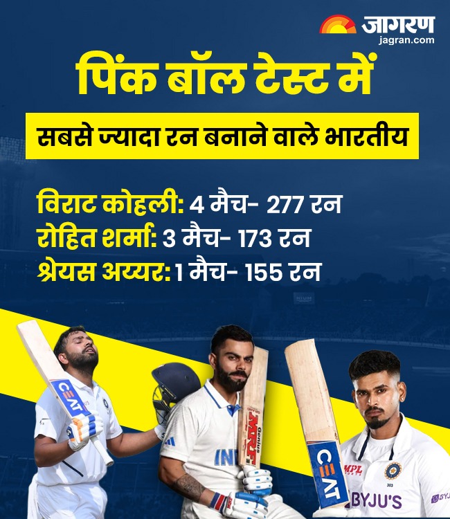 पिंक बॉल टेस्ट में सबसे ज्यादा रन बनाने वाले भारतीय बल्लेबाज विराट कोहली हैं। विराट ने 4 मैच में 46.16 की औसत से 277 रन बनाए हैं। इस लिस्ट में दूसरे नंबर पर रोहित शर्मा और तीसरे पर श्रेयस अय्यर हैं। रोहित ने 3 मैच में 173 रन और श्रेयस ने 1 मैच में 155 रन बनाए हैं।