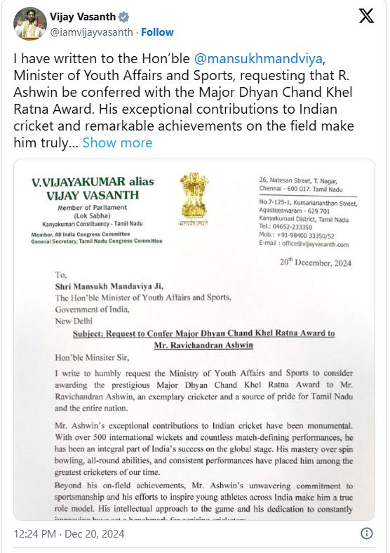 विजय वसंत ने एक्स पर एक पोस्ट में लिखा, मैंने युवा मामले और खेल मंत्री मनसुख मांडविया को पत्र लिखकर अनुरोध किया है कि आर अश्विन को मेजर ध्यानचंद खेल रत्न पुरस्कार से सम्मानित किया जाए। भारतीय क्रिकेट में उनके असाधारण योगदान और मैदान पर उल्लेखनीय उपलब्धियां उन्हें वास्तव में इस सम्मान का हकदार बनाती हैं।