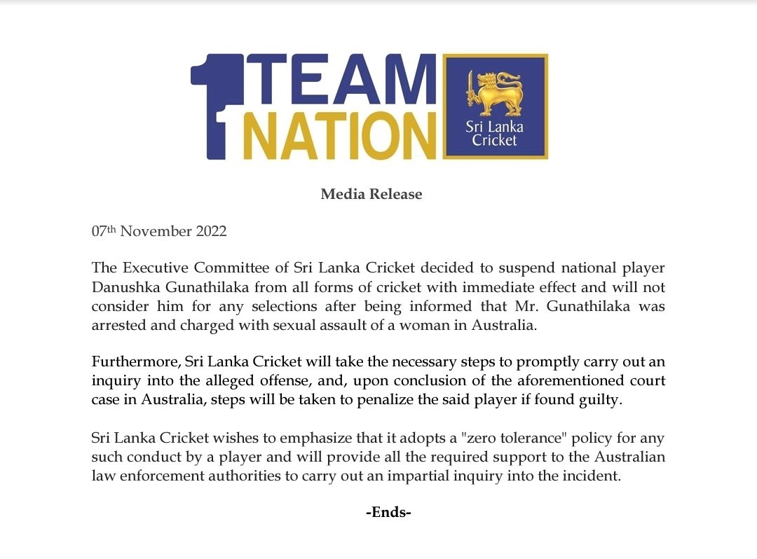 श्रीलंका क्रिकेट बोर्ड की तरफ से दानुष्का गुणाथिलाका के खिलाफ बड़ी कार्रवाई करते हुए उन्हें क्रिकेट के सभी प्रारूपों के लिए सस्पेंड कर दिया है और उन्हें तत्काल प्रभाव से सेलेक्शन के लिए कंसिडर नहीं किया जाएगा। बोर्ड द्वारा आगे कहा गया है कि उनके खिलाफ जरूरी आवश्यक कदम आगे भी उठाए जाएंगे। श्रीलंका बोर्ड इस तरह की घटना पर जीरो टॉलरेंस अपनाएगा और पूरी तरह से ऑस्ट्रेलिया के साथ खड़ा रहेगा।