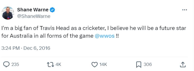 शेन वॉर्न ने साल 2016 में हेड को लेकर भविष्यवाणी की थी। उस वक्त गुजरे हुए तकरीबन 8 साल हो चुके हैं। पिछले दो साल में हेड के बल्ले का जादू हर किसी के सिर चढ़कर बोला है। उन्होंने ऑस्ट्रेलिया को पहली बार वर्ल्ड टेस्ट चैंपियन और वनडे वर्ल्ड कप 2023 में चैंपियन बनाने में अहम भूमिका निभाई। दोनों के फाइनल में उन्होंने शतक जड़े थे।