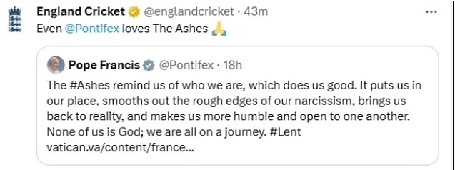 यह घटना तब हुई जब ईसीबी ने ईसाई कैलेंडर के महत्वपूर्ण दिन 'ऐश बुधवार' को पोप फ्रांसिस के सोशल मीडिया पोस्ट का जवाब दिया, जो लेंट की शुरुआत का प्रतीक है। ईसीबी ने कमेंट करते हुए ऑस्ट्रेलिया के खिलाफ इंग्लैंड की टेस्ट सीरीज का उदाहरण दिया, जिसे "एशेज" के नाम से जाना जाता है। ईसीबी ने सोशल मीडिया पर लिखा था, "पोप को भी एशेज बहुत पसंद है।"