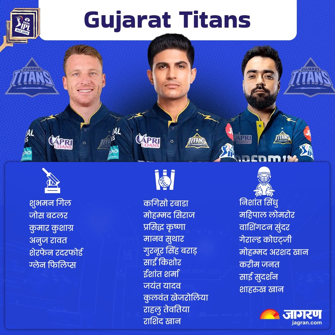 गुजरात टाइटंस ने जेद्दा में संपन्न आईपीएल 2025 मेगा नीलामी के जरिये अपना 25 सदस्यीय स्क्वाड तैयार कर लिया है। एक बार आईपीएल खिताब जीत चुकी गुजरात के लिए आईपीएल 2025 नीलामी में सबसे महंगे खिलाड़ी रहे जोस बटलर। इंग्लैंड के विकेटकीपर बल्लेबाज को फ्रेंचाइजी ने 15.75 करोड़ रुपये में खरीदा। याद हो कि टाइटंस ने आईपीएल 2025 सीजन के लिए पांच खिलाड़ियों को रिटेन किया था।