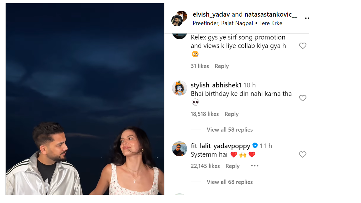 नताशा ने एल्विश के साथ एक वीडियो पोस्ट किया है। इस वीडियो में नताशा और एल्विश एक पंजाबी गाने पर प्यार भरी वॉक करते नजर आ रहे हैं। दोनों एक दूसरे को ऐसे देख रहे हैं जैसे कोई कपल हो। नताशा इस वीडियो में सफेद ड्रेस में हैं तो वहीं एल्विश काली टीशर्ट, सिल्वर रंग की जैकेट और काले ट्राउजर में नजर आ रहे हैं। एल्विश ने ये वीडियो अपने इंस्टाग्राम पर पोस्ट किया है और कैप्शन दिया है, "Vibin' On A Whole New Level" यानी मस्ती, एक अलग की अंदाज में।