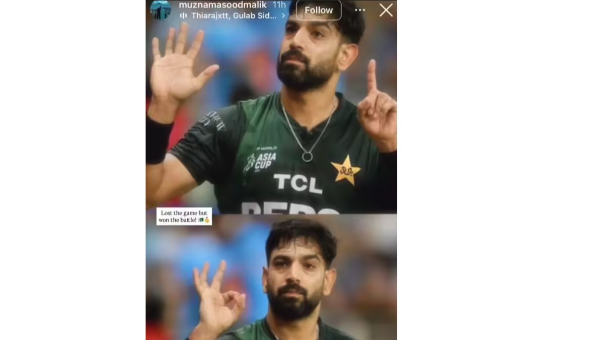 हारिस की पत्नी ने अपने इंस्टाग्राम पर स्टोरी पर उनके दो फोटो पोस्ट किए हैं। हारिस मैच में बाउंड्री पर फील्डिंग करते हुए भारतीय फैंस के सामने 6-0 का इशारा कर रहे थे। दरअसल, ऑपरेशन सिंदूर के दौरान पाकिस्तान ने दावा किया था कि उसने भारत के छह राफेल विमान गिराए जबकि भारत एक भी नहीं गिरा पाया। इसी को लेकर हारिस भारतीय फैंस को चिढ़ा रहे थे। हारिस की यही फोटो उनकी पत्नी ने इंस्टाग्राम पर पोस्ट की हैं और लिखा है, "मैच हार गए लेकिन जंग जीत गए।"