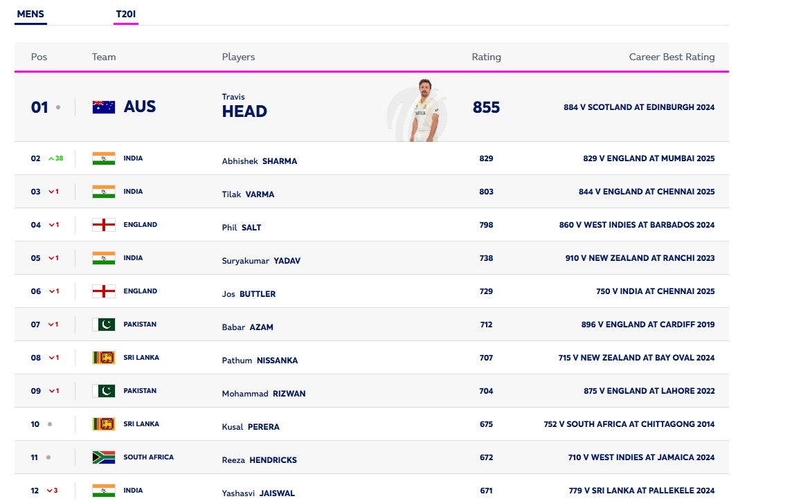 उनका रेटिंग प्वाइंट 829 है। वहीं, ट्रेविस हेड नंबर-1 पर 855 रेटिंग के साथ मौजूद है। तीसरे स्थान पर तिलक वर्मा है, जिन्हें एक स्थान का घाटा हुआ है। इंग्लैंड के फिल साल्ट भी एक स्थान का नुकसान झेलकर चौथे पायदान पर खिसक गए हैं। सूर्यकुमार यादव, जोस बटलर, बाबर आजम और पाथुम-मोहम्मद रिजवान को भी एक-एक स्थान का नुकसान हुआ है।