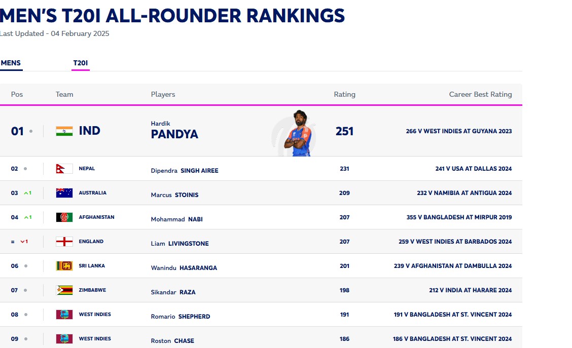 आईसीसी टी20I ऑलराउंडर्स रैंकिंग में हार्दिक पांड्या 251 रेटिंग के साथ नंबर-1 पर मौजूद हैं। नेपाल के दीपेंद्र सिंह दूसरे पायदान पर हैं, जबकि ऑस्ट्रेलिया के मार्नस स्टोइनिस और अफगानिस्तान के मोहम्मद नबी एक-एक स्थानों की छलांग के साथ तीसरे और चौथे पायदान पर क्रमश: शुमार हैं।