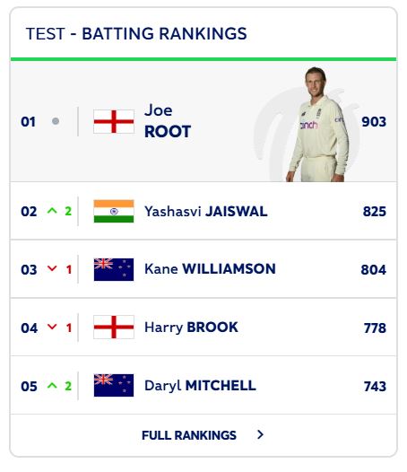 बल्लेबाजी रैंकिंग की बात करें तो भारतीय टीम के युवा बल्लेबाज यशस्वी जायसवाल ने शानदार शतकीय पारी खेल कर दो स्थानों की लंबी छलांग लगाई। वह ताजा जारी हुई ICC Test Batting Rankings में दूसरे स्थान पर पहुंच गये हैं। जायसवाल ने 161 रनों की शानदार पारी खेलकर मैच को भारत के पक्ष में मोड़ दिया और इसके परिणामस्वरूप टेस्ट बल्लेबाजों की रैंकिंग में दो स्थान की बढ़त के साथ दूसरे स्थान पर पहुंच गए।