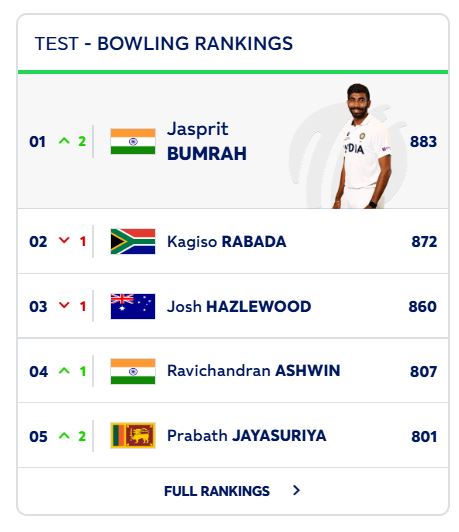 बुमराह ने बॉर्डर-गावस्कर ट्रॉफी के पहले मैच में भारत की 295 रन की प्रभावशाली जीत के दौरान आठ विकेट चटकाए और प्लेयर ऑफ द मैच का खिताब जीता। फॉर्म में चल रहे दाएं हाथ के इस गेंदबाज ने दो पायदान की छलांग लगाई और साउथ अफ्रीका के तेज गेंदबाज कगिसो रबाडा और ऑस्ट्रेलिया के तेज गेंदबाज जोश हेजलवुड को पीछे छोड़कर टेस्ट क्रिकेट में नंबर वन की कुर्सी हासिल की।