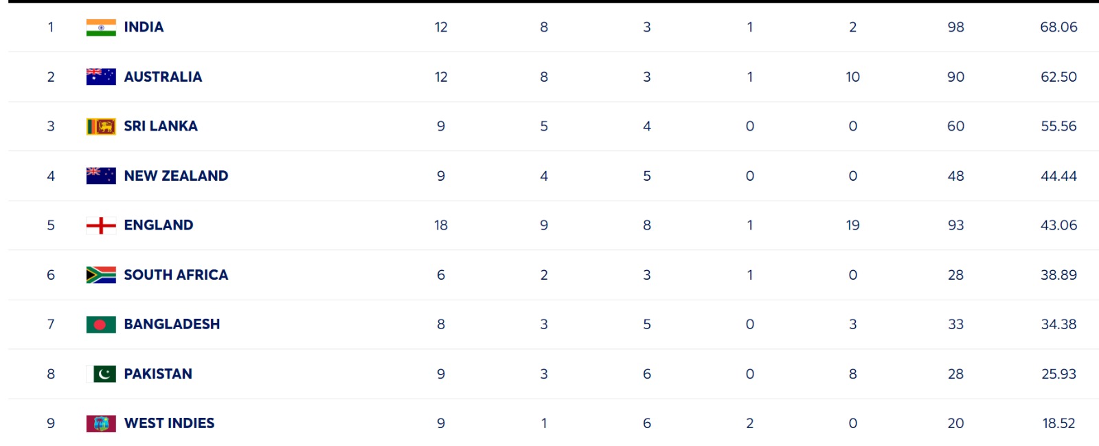 इस बीच इंग्लैंड को भी नजरअंदाज नहीं किया जा सकता जिसका प्रतिशत 43.06 है और उसे पाकिस्तान के खिलाफ कुछ ही दिनों में एक और टेस्ट मैच खेलना है।
