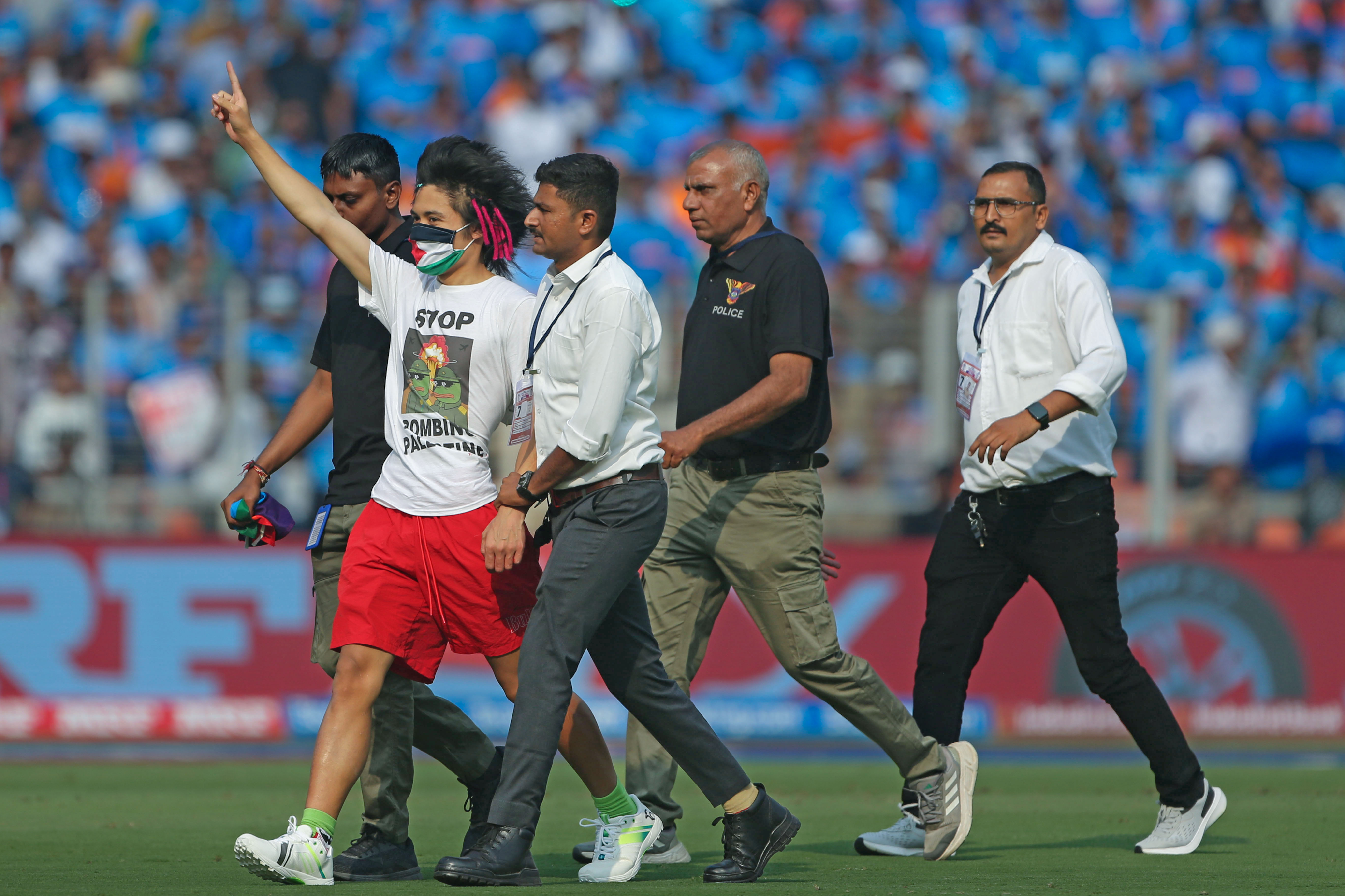 यह घटना भारतीय पारी के 14वें ओवर में घटी। जब एक फलस्तीन का एक समर्थक मैदान के गार्ड को छकाते हुए मैदान पर जा घुसा और विराट कोहली से मुलाकात की की। दरअसल, फैन का मकसद गाजा में हो रहे हमले का विरोध प्रदर्शन करना था। फैन ने जो टी-शर्ट पहनी हुई थी उस पर, 'फलस्तीन पर हमला करना बंद करो' का स्लोगन लिखा हुआ था।