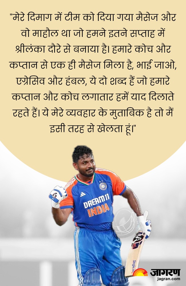 संजू ने कहा, "मेरे दिमाग में टीम को दिया गया मैसेज और वो माहौल था जो हमने इतने सप्ताह में श्रीलंका दौरे से बनाया है। हमारे कोच और कप्तान से एक ही मैसेज मिला है, भाई जाओ, एग्रेसिव और हंबल, ये दो शब्द हैं जो हमारे कप्तान और कोच लगातार हमें याद दिलाते रहते हैं। ये मेरे व्यवहार के मुताबिक है तो मैं इसी तरह से खेलता हूं।"