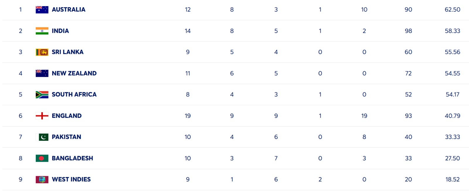 वहीं न्यूजीलैंड की टीम चौथे स्थान पर आ गई है। उसके 11 मैचों में छह जीत और तीन हार के बाद 72 अंक और 54.55 प्रतिशत अंक हैं।