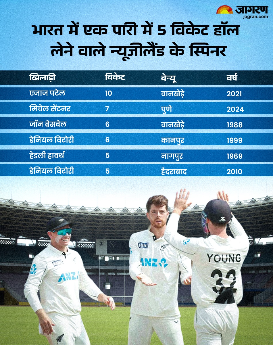 स्पोर्ट्स डेस्क, नई दिल्ली। भारतीय टीम पुणे में खेले जा रहे दूसरे टेस्ट मैच की पहली पारी में बड़ा स्कोर नहीं कर सकी। न्यूजीलैंड के 259 रनों के जवाब में टीम इंडिया 156 रनों पर ही ढेर हो गई। भारत के दिग्गज बल्लेबाज कीवी टीम के गेंदबाजों के सामने टिक नहीं सके। इसमें सबसे बड़ा रोल निभाया बाएं हाथ के स्पिनर मिचेल सैंटनर ने। सैंटनर ने ऐसा प्रदर्शन किया है जिसने उन्हें दिग्गजों की लिस्ट में खड़ा कर दिया है।