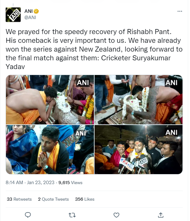 भस्म आरती के बाद सूर्य कुमार ने मीडिया से बातचीत करते हुए बताया कि महाकाल दर्शन कर बहुत अच्छा लगा। हमने ऋषभ पंत के शीघ्र स्वस्थ होने की प्रार्थना की। उनकी वापसी हमारे लिए काफी अहम है। हम न्यूजीलैंड के खिलाफ पहले ही सीरीज जीत चुके हैं, अब उनके खिलाफ फाइनल मैच का इंतजार है।
