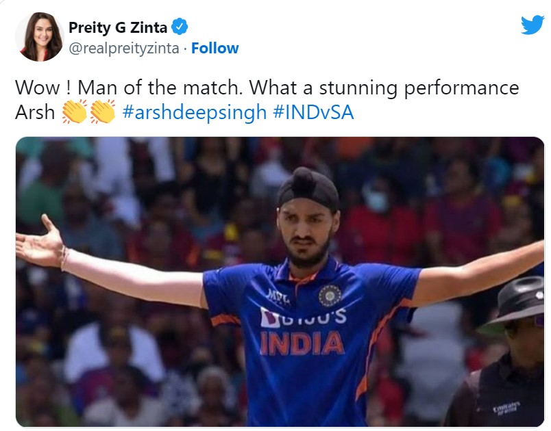 आइपीएल में अर्शदीप सिंह जिस टीम के लिए खेलते हैं यानी पंजाब किंग्स टीम की ओनर प्रीति जिंटा ने सोशल मीडिया प्लेटफॅार्म के जरिए अर्शदीप सिंह की तारीफ की है। अर्शदीप ने साउथ अफ्रीका के खिलाफ एक ही ओवर में साउथ अफ्रीका के तीन बल्लबाजों को पवेयिलन लौटा दिया।