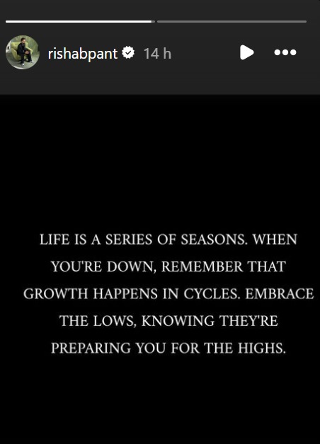 पंत इस सीरीज में टीम इंडिया के लिए सबसे ज्यादा रन बनाने वाले बल्लेबाज रहे। मुंबई टेस्ट मैच की दोनों पारियों में उन्होंने अर्धशतक जमाए। पहली पारी में पंत ने 60 और दूसरी पारी में 64 रन बनाए। मैच के बाद पंत ने अपने इंस्टाग्राम पर एक स्टोरी पोस्ट की है और बताया है कि जीवन में बुरा दौर आता है ताकि वो हमें अच्छे समय के लिए तैयार कर सके। पंत ने लिखा, "जीवन सीजनों की एक सीरीज है। जब आप हताश हो तो याद रखिए जीवन में तरक्की अलग-अलग समय चक्रों में होती है। बुरे समय को अपनाए, ऐसा जानते हुए कि ये आपको अच्छे समय के लिए तैयार कर रहा है।"